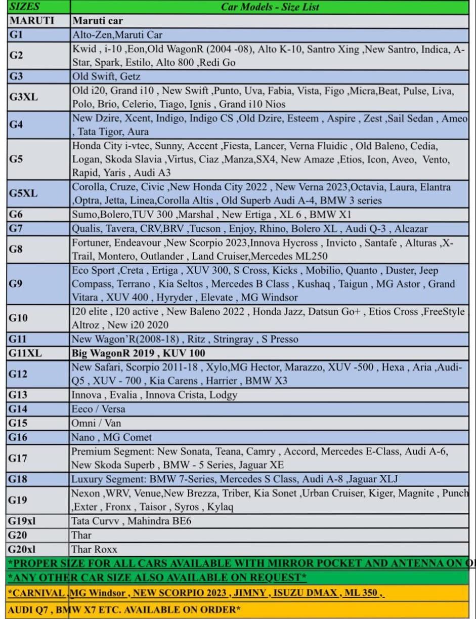 Product Name: Universal Car CoverPackage Contains: Pack of 1Combo: Pack of 1Color: AssortedMaterial: PolyesterLBH: 27*5*18 CentimetresWeight: 486 gmProvides reliable protection against rain, snow, and extreme weather conditions, keeping your car dry and clean.
